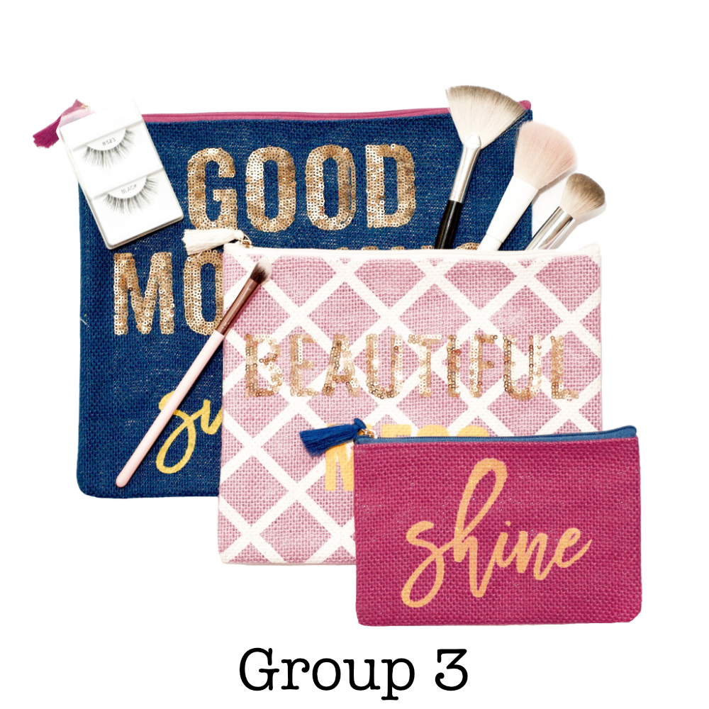 These cute cosmetic bags are a FUN must-have for any season! This set includes 3 different-sized bags, and the possibilities are endless! The long-lasting jute material allows the sequence design to POP, and a smooth wipe-clean laminated interior makes these durable and ready for anything.